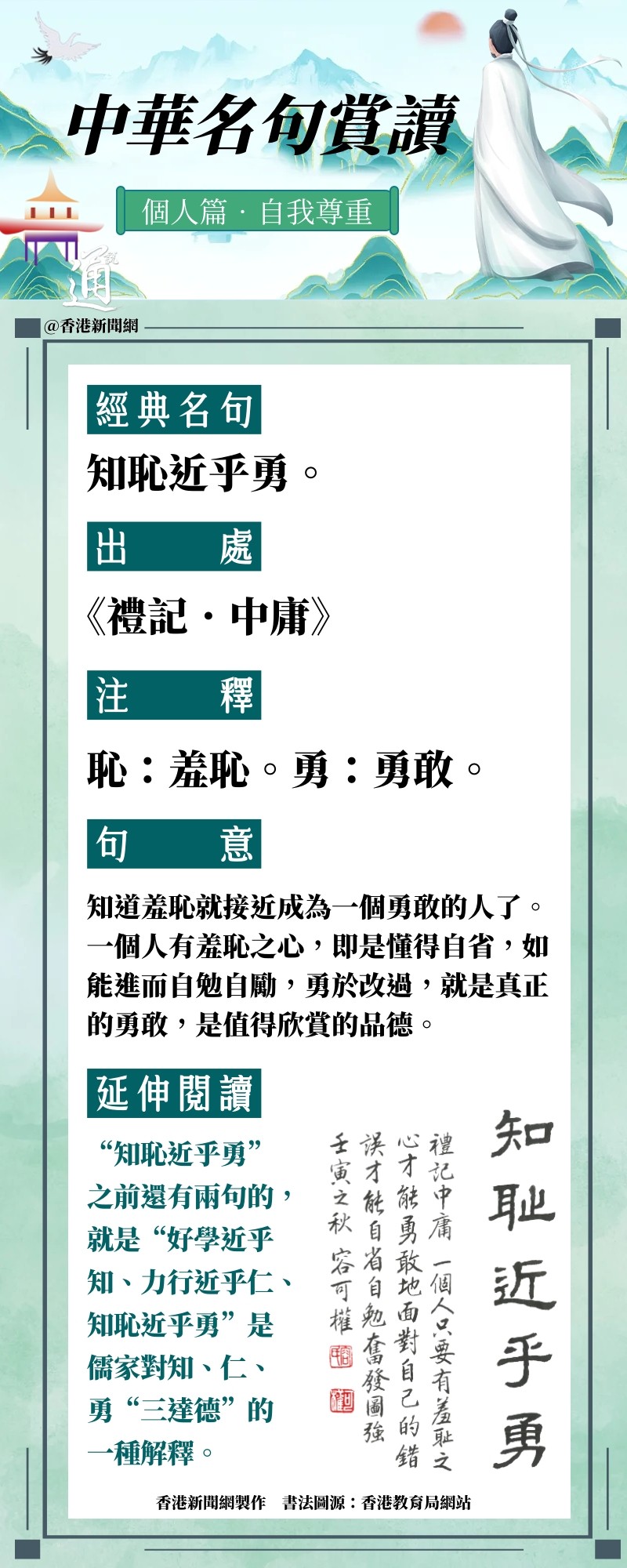 香港新聞網6月29日電  中華文化源遠流長,博大精深,而中華文化精神極大部分都呈現於中國文學經典作品之中。為加強中國文學和文言經典的學習,香港特區政府教育局繼續開展“中華經典名句推廣活動”,從《致知達德》(中華傳統美德語文學習資源)中選取40則名句,作為本學年推廣的內容,並分為個人篇、親屬/師友篇和國家篇,涵蓋了自我尊重、認真負責、勤奮堅毅、尊重別人、心繫祖國等多個主題。香港新聞網今起推出“中華名句賞讀”系列,敬請關注。