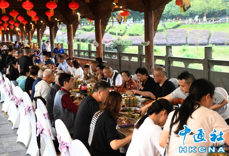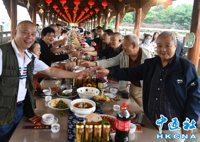 •   6月21日,廊橋千米長桌宴迎端午活動在重慶市榮昌區舉辦,吸引民眾前往體驗。圖為民眾在廊橋上品嘗長桌宴。 香港中通社圖片