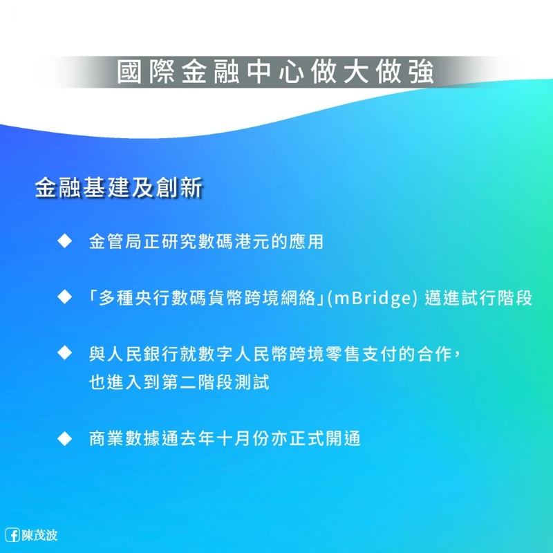 陳茂波網誌圖片。 陳茂波表示,過去幾年疫情帶來不少經濟挑戰,特區政府果斷採取擴張性財政政策,推出大規模逆周期措施,克服各項短中期的挑戰和風險;並以跨周期視野、全方位推動中長期發展。要抓緊國家發展帶來的歷史機遇,以國際視野結合香港角度,考量全局、部署長遠。透過把“有為政府”與“高效市場”更好結合,以政策及機制的創新,增強經濟發展動能,發掘及培育新經濟增長點,並力求加速提升傳統產業的生產力和競爭力。