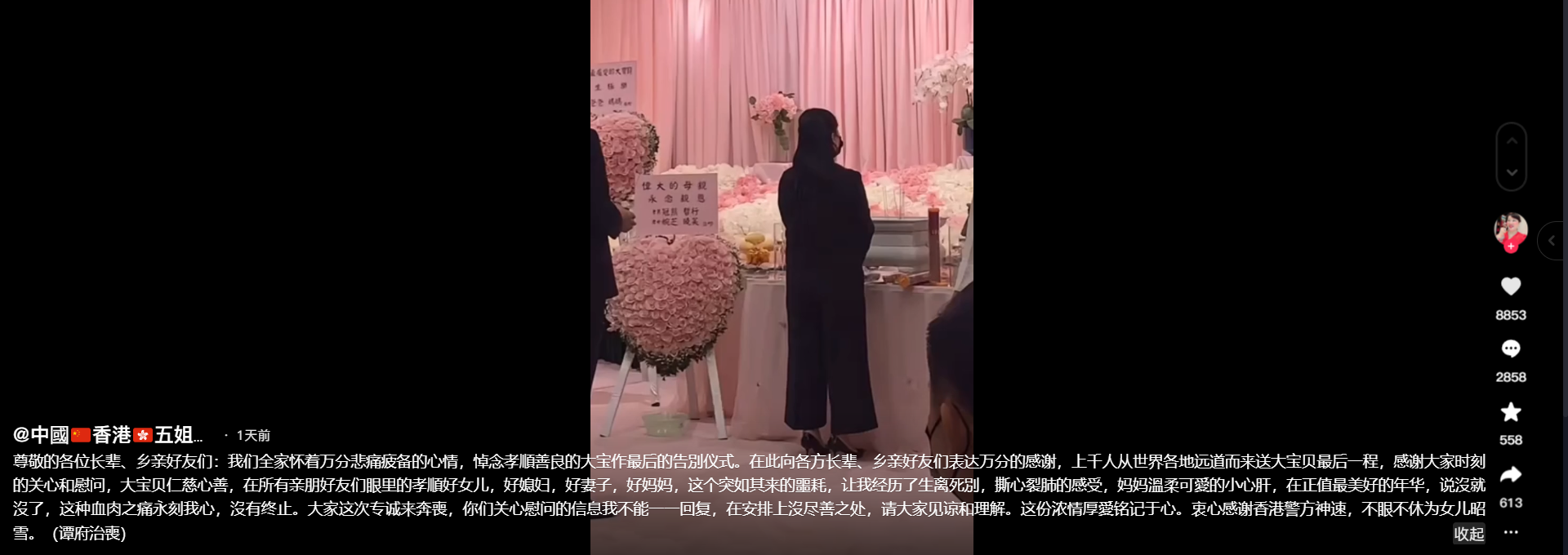 影片截圖 影片長約5分鐘,當中包括蔡天鳳生前的照片、親友參加告別儀式及家屬鞠躬的片段。“五姐”在文中表示感謝各方親友的關心與慰問,亦感謝香港警方不眠不休為女兒昭雪。她形容女兒仁慈心善,也是所有親朋好友眼裡的孝順好女兒、好媳婦、好妻子、好媽媽。然而女兒的離世讓她經歷了生離死別,撕心裂肺的感受。“五姐”悲痛指,“媽媽溫柔可愛的小心肝,在正值最美好的年華,說沒就沒了,這種血肉之痛永刻我心,沒有終止。”