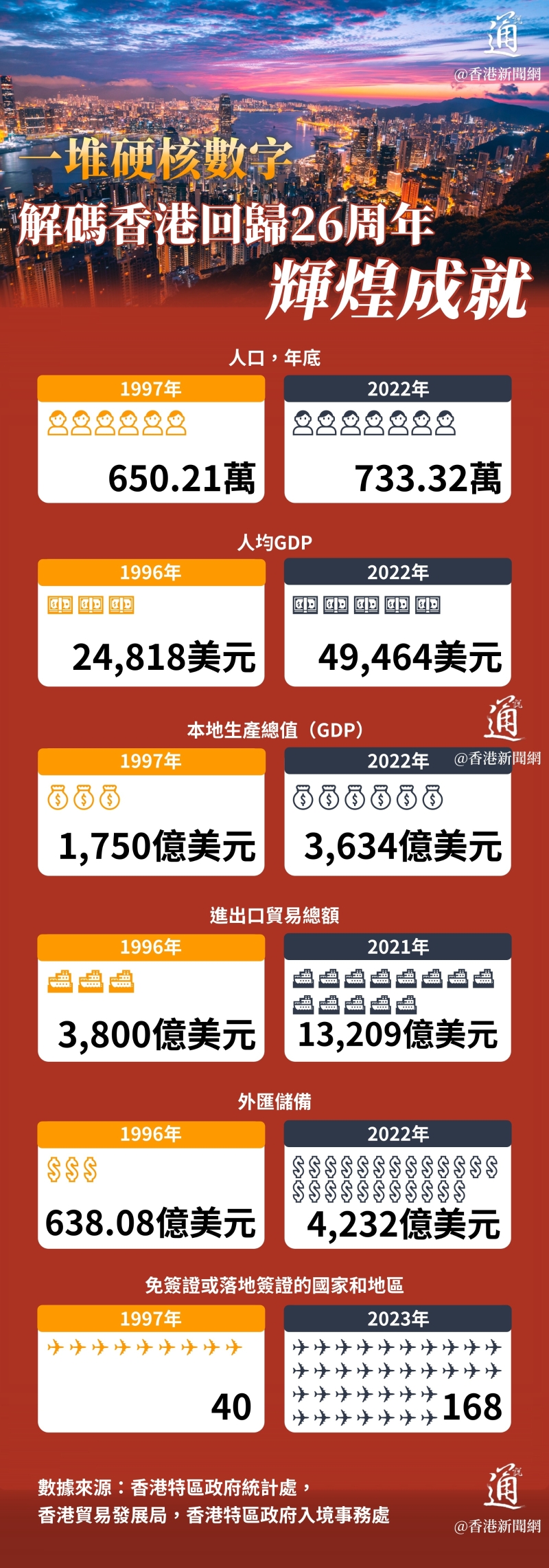 香港新聞網7月1日電 “小河彎彎向南流,流到香江去看一看。東方之珠,我的愛人,你的風采是否浪漫依然”。 2023年是香港回歸祖國26周年,即香港特區成立26周年的大日子,也是今屆特區政府上任一周年。26年來,在“一國兩制”“愛國者治港”等方針下,香港在經貿、法治、教育、衛生、文化等領域取得了一系列亮眼成就,與內地的交流也日趨頻繁。26年間,香港的總人口數量從回歸時的650萬,一路增長到2022年的733萬。本地生產總值從1,750億美元增長至2022年的3,634億美元,兩倍的漲幅見證了香港從“小漁村”到亞洲四小龍再一躍成為國際金融中心的發展歷程。人均GDP亦從回歸時約2.5萬美元發展至近5萬美元。下面,我們通過多組數據,一起回顧“東方之珠”26年的風華巨變。