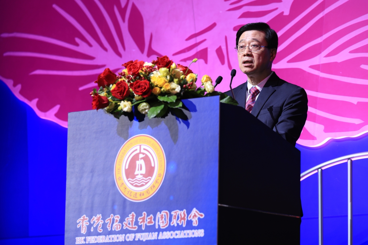 圖為香港特區行政長官李家超致辭。(香港中通社記者 許其皓攝) 李家超在典禮上致辭表示,福建和香港同處泛珠三角地區,同樣依山半海。多年來,不少原籍福建的居民在香港落地生根,對香港各行各業作出重要貢獻。香港福建社團聯會一直心系社區和家鄉,堅定支持特區政府依法施政,是愛國愛港的中堅分子。相信聯會將一如既往繼續推動閩港兩地的緊密合作,一起為國家和香港的未來貢獻所長。 他表示,今年是“一帶一路”倡議10周年。福建是21世紀海上絲綢之路核心區,香港是“一帶一路”倡議的首選平台,兩地正好乘風破浪,共同貢獻國家高質量發展。