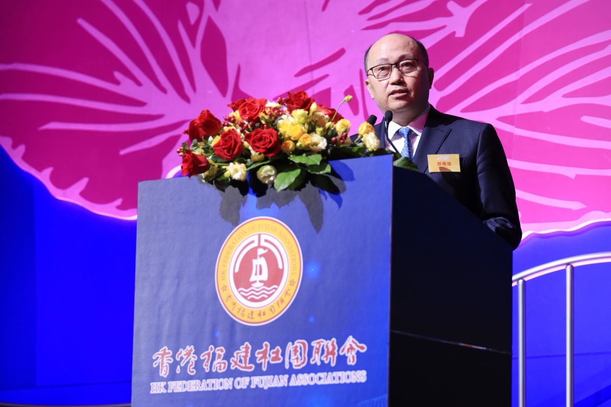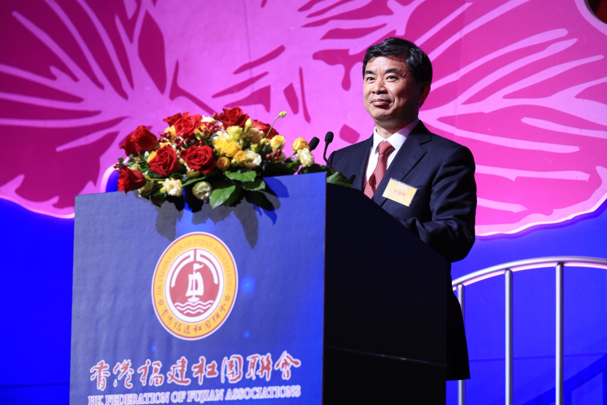 圖為福建省委書記周祖翼致辭。(香港中通社記者 許其皓攝) 福建省委書記周祖翼致辭表示,福建香港社團聯會與香港風雨同舟,始終擁護“一國兩制”方針,堅定支持“愛國者治港”原則,為維護香港長期繁榮穩定作出了重要貢獻,得到社會各界的廣泛贊譽。希望聯會當好福建與香港、與世界的橋樑紐帶,講好中國故事,福建故事。