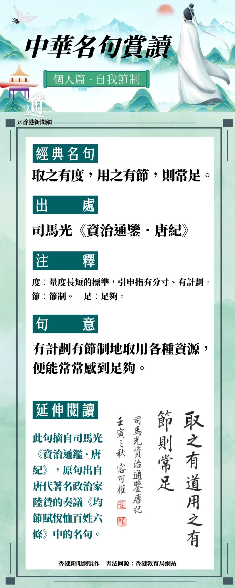 香港新聞網7月7日電 2019年,國家主席習近平出席中國北京世界園藝博覽會開幕式發表重要講話時,提出大家要有重視生態的環保意識時,說了一句古語:“取之有度,用之有節”,這句話是甚麼意思呢? 為加強中國文學和文言經典的學習,香港特區政府教育局繼續開展“中華經典名句推廣活動”,從《致知達德》(中華傳統美德語文學習資源)中選取40則名句,作為本學年推廣的內容。香港新聞網推出“中華名句賞讀”系列,涵蓋自我尊重、認真負責、勤奮堅毅、尊重別人、心繫祖國等多個主題。今日分享“自我節制”主題之“取之有度,用之有節,則常足”,出自司馬光《資治通鑒.唐紀》。