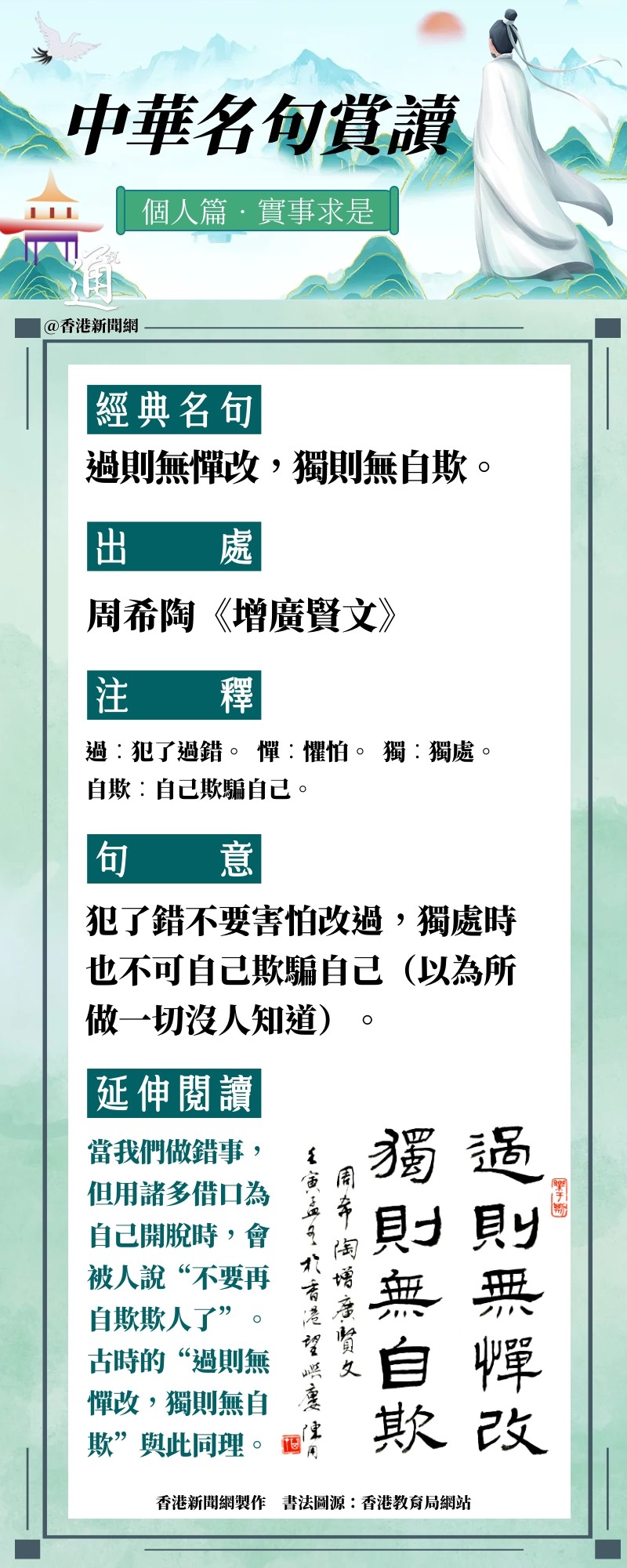 為加強中國文學和文言經典的學習,香港特區政府教育局繼續開展“中華經典名句推廣活動”,從《致知達德》(中華傳統美德語文學習資源)中選取40則名句,作為本學年推廣的內容。香港新聞網“中華名句賞讀”系列,今日為大家解讀名句“過則無憚改,獨則無自欺”
