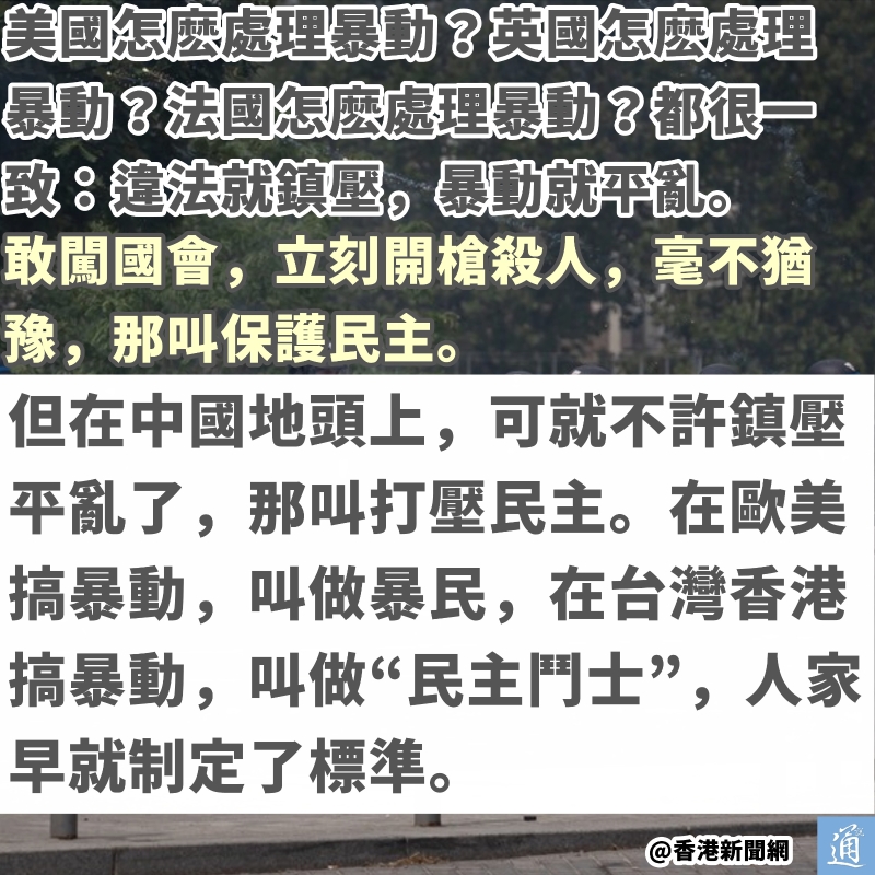 台媒體人批西方“雙標” 所謂“民主鬥士”變暴徒了?香港新聞網7月3日電 一名法國非裔十七歲青少年,因開車拒絕警方臨檢,便被警員開槍射殺,隨後大規模騷亂席捲全法。 自6月27日抗議活動發生以來,法國已有700多家商店、超市、餐館和銀行分行“被洗劫一空,有的甚至被燒毀”。法國已經在全國範圍部署4.5萬名警察和憲兵,並投入裝甲車和直升機維持秩序。 法國總統馬克龍提前從布魯塞爾歐盟峰會返回巴黎,又宣布推遲原定對德國的國事訪問。他公開呼籲法國的家長們“管住自己的子女,不要讓年輕人上街暴動”,並呼籲社交媒體要“移除太過暴力的抗爭畫面”。 此情此景,不由得讓人想起2019年香港爆發的“修例風波”。對比這兩件事,台灣媒體人黃智賢由衷感歎:“原來在歐美搞暴動,叫做暴民,在台灣香港搞暴動,就叫做‘民主鬥士’!” 香港黑暴時期,以美國為首的西方國家顛倒黑白,抹黑香港警察,美化黑暴分子,公開鼓勵香港年輕人暴力襲擊警察,放火燒地鐵,洗劫商店。時任美國國會眾議長佩洛西甚至將發生在香港的暴力稱為“美麗的風景線”。 “他們可不希望香港家長‘管好自己的子女’,那叫做壓抑覺醒,他們全力讓社交媒體對香港警察造謠,用各種血腥畫面,鼓動香港年輕人,以為暴力攻擊才是民主。”黃智賢一針見血地揭開歐美政客“雙標”嘴臉,“不讓播出血腥畫面?那是港府在‘打壓’言論自由!” 當法國爆發騷亂,法國政府開始考慮讓國家要進入“緊急狀態”。因為這會給政府更大的緊急處分權,可以宵禁,可以禁止示威,並讓警方有更大的權力制止“嫌疑暴民”,搜索居民房屋。 “原來制止暴民才是政府該做的事呀!”黃智賢反問稱,“美國怎麽處理暴動?英國怎麽處理暴動?法國怎麽處理暴動?都很一致:違法就鎮壓,暴動就平亂。敢闖國會,立刻開槍殺人,毫不猶豫,那叫保護民主。”