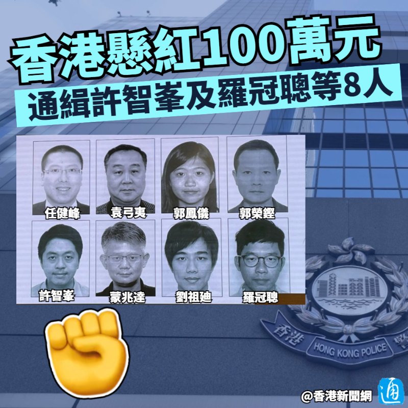 港警各懸紅100萬元 通緝許智峯及羅冠聰等8人香港新聞網7月3日電香港警務處國家安全處今日(3日)下午召開記者會,指通緝8名逃竄至海外的反中亂港分子,包括許智峯、羅冠聰、郭榮鏗、袁弓夷、任建峰、郭鳳儀、劉祖廸及蒙兆達,並每人懸紅100萬元