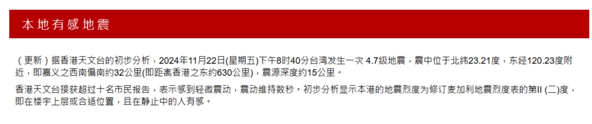 香港天文台圖片。 據香港天文台的初步分析,地震發生在河源之西北偏西約23公里,震源深度約9公里。 香港天文台接獲超過十名市民報告,表示感到輕微震動,震動維持數秒。初步分析顯示,香港的地震烈度為修訂麥加利地震烈度表的第三度,即室內有感,類似小型貨車駛過的振動。(完) 【編輯:孟宜君】