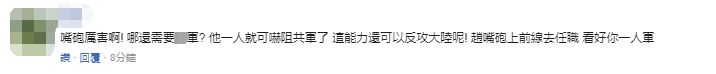 還有網友諷刺趙天麟“嘴炮”,“哪還需要台軍?他一人就可嚇阻解放軍了,這能力還可以反攻大陸呢!趙嘴炮上前線去任職,看好你一人軍。” ↓