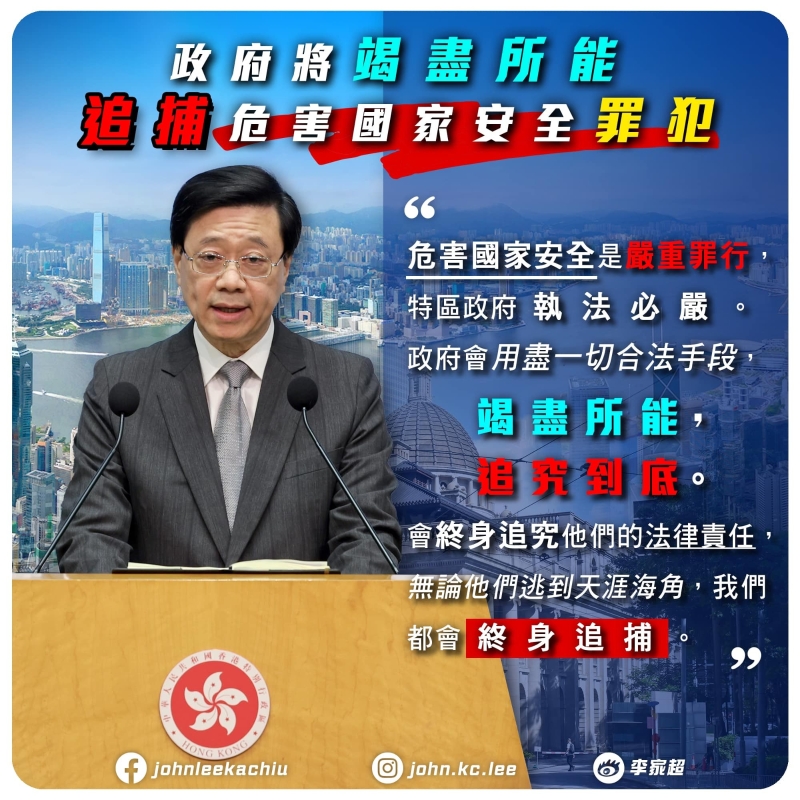 李家超。香港中通社資料圖片 李家超指,國安處的行動是履行責任維護國家安全,形容為應當及有效的做法,警方高度重視案件,呼籲市民就相關案件提供有關訊息。 他強調危害國安是嚴重罪行,特區政府執法必嚴,會用盡一切可行的方法,終身追究其法律責任。“無論涉案人走到天涯海角,都會終身追捕這些罪犯”。李家超又指,提供訊息的人可以獲得懸紅獎金,即使是通緝人的親戚朋友都有資格。