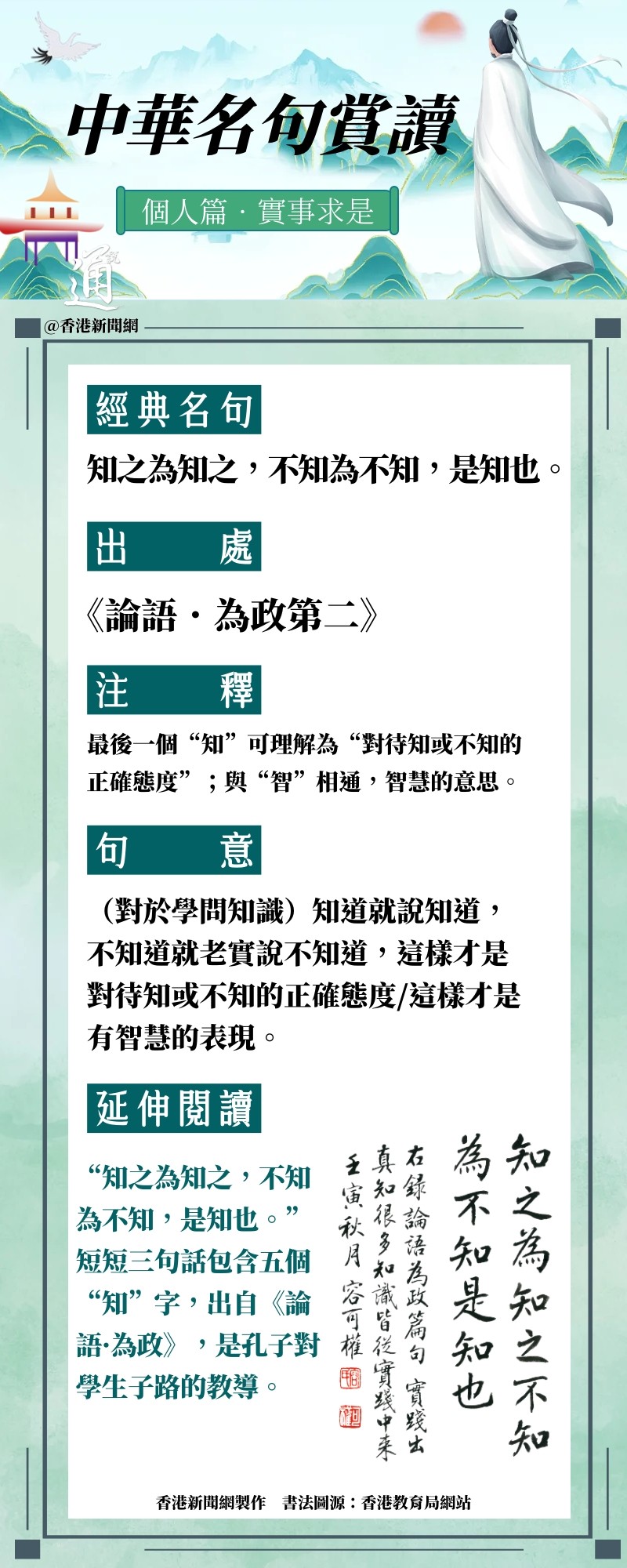 “知之為知之,不知為不知,是知也”,三句五個“知”,出自《論語·為政》,是孔子對學生子路的教導。“知之為知之,是知也”聽起來十分合理,但為甚麼“不知為不知”又會“是知也”?請見香港新聞網“中華名句賞讀”系列解讀。