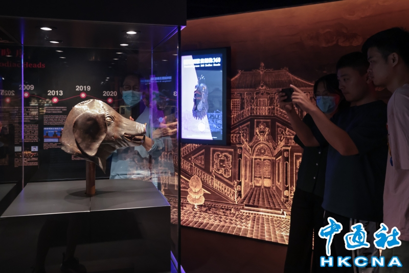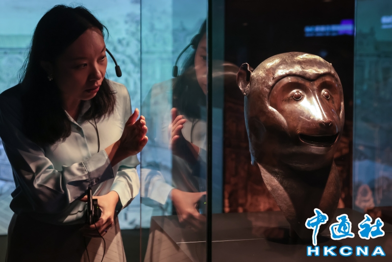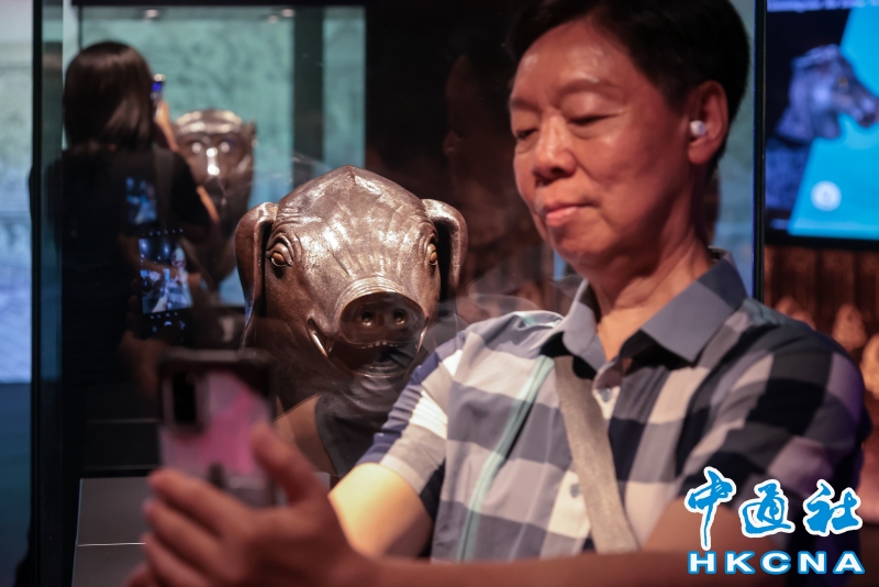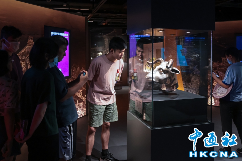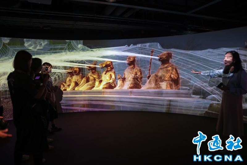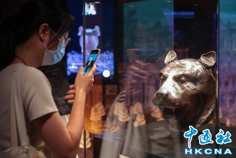 7月4日,香港城市大學般哥展覽館推出“盛世聚首 天寶芳華:圓明園獸首暨文物展”,向公眾免費展出圓明園海晏堂中虎、豬、牛、猴四尊獸首銅像原物。除展出實物外,展覽亦透過各種沉浸式體驗、創新的藝術科技,和其他創新的互動手法,讓觀眾得以動態方式理解世界文化遺產的保育、藝術科技和歷史變遷。(香港中通社記者 謝光磊 攝) 香港中通社圖片