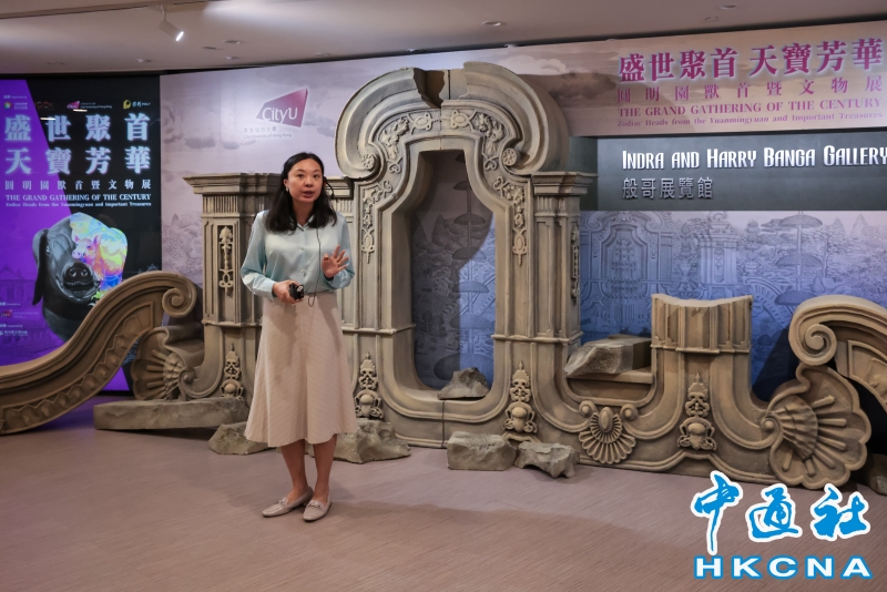 7月4日,香港城市大學般哥展覽館推出“盛世聚首 天寶芳華:圓明園獸首暨文物展”,向公眾免費展出圓明園海晏堂中虎、豬、牛、猴四尊獸首銅像原物。圖為般哥展覽館館長陳麗碧講解展覽。(香港中通社記者 謝光磊 攝) 香港中通社圖片