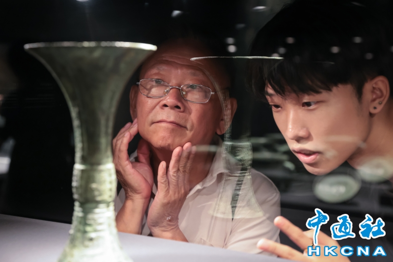 7月4日,香港城市大學般哥展覽館推出“盛世聚首 天寶芳華:圓明園獸首暨文物展”,向公眾免費展出圓明園海晏堂中虎、豬、牛、猴四尊獸首銅像原物。除圓明園獸首外,包括國家一級文物“遂公盨”在內的一批早期中國青銅禮器等珍寶也於該展覽同期展出。圖為市民參觀青銅禮器。(香港中通社記者 謝光磊 攝) 香港中通社圖片