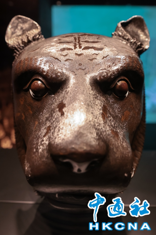 7月4日,香港城市大學般哥展覽館推出“盛世聚首 天寶芳華:圓明園獸首暨文物展”,向公眾免費展出圓明園海晏堂中虎、豬、牛、猴四尊獸首銅像原物。圖為虎首。(香港中通社記者 謝光磊 攝) 香港中通社圖片