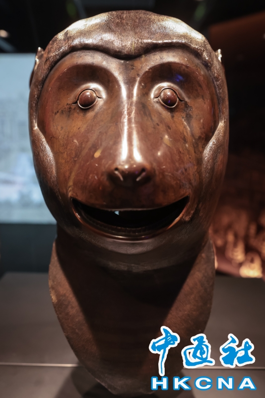 7月4日,香港城市大學般哥展覽館推出“盛世聚首 天寶芳華:圓明園獸首暨文物展”,向公眾免費展出圓明園海晏堂中虎、豬、牛、猴四尊獸首銅像原物。圖為猴首。(香港中通社記者 謝光磊 攝) 香港中通社圖片