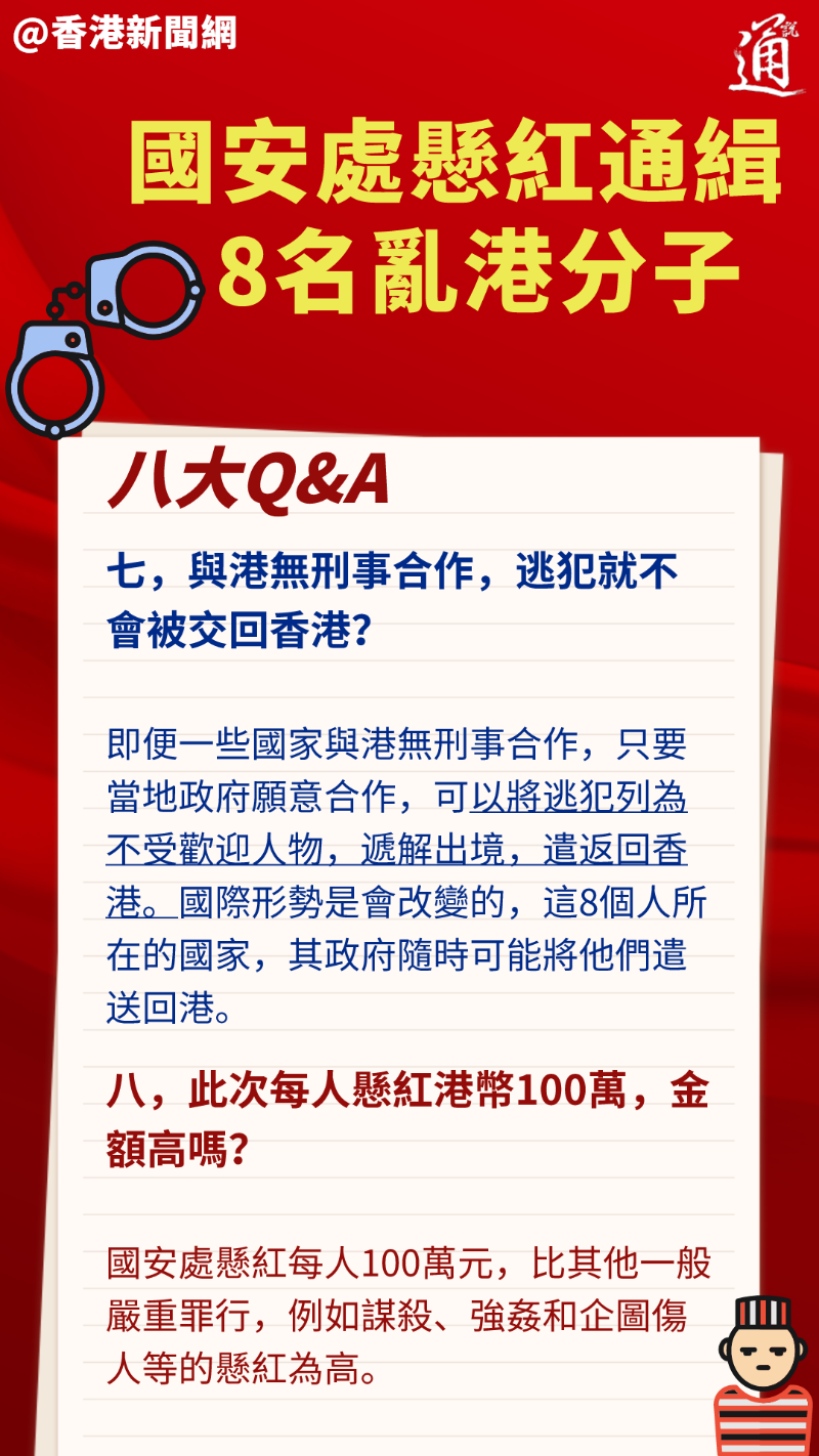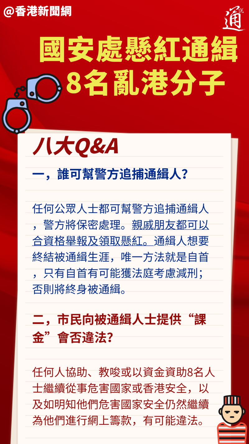 誰可幫警方追捕這8人,警方會否保密爆料人?市民追看被通緝人士發文或直播,是否違法?一些國家與香港無刑事合作,是否意味逃犯就不會被交回香港?關於懸紅通緝人士公告的這些疑問,戳下圖,一一為你解答!