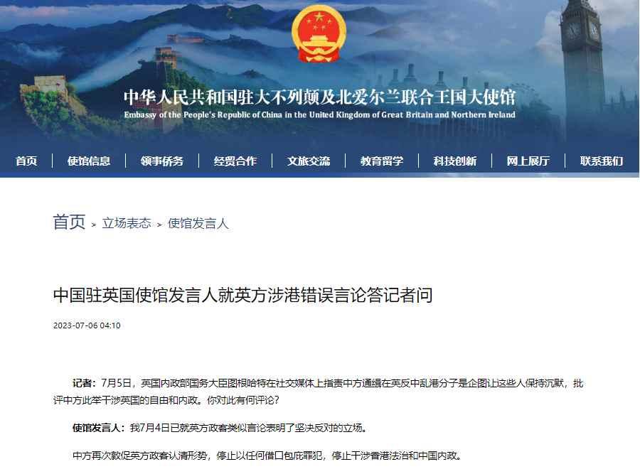 有記者問:7月5日,英國內政部國務大臣圖根哈特在社交媒體上指責中方通緝在英反中亂港分子是企圖讓這些人保持沉默,批評中方此舉干涉英國的自由和內政。你對此有何評論? 使館發言人說:我7月4日已就英方政客類似言論表明了堅決反對的立場。 發言人說,中方再次敦促英方政客認清形勢,停止以任何借口包庇罪犯,停止干涉香港法治和中國內政。(完) 【編輯:丘志彬】