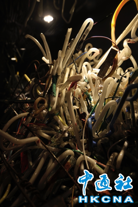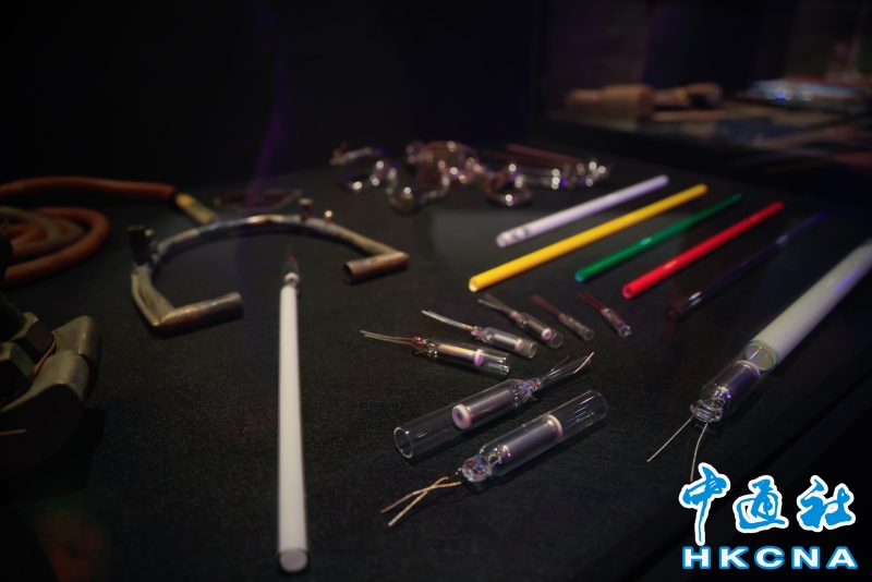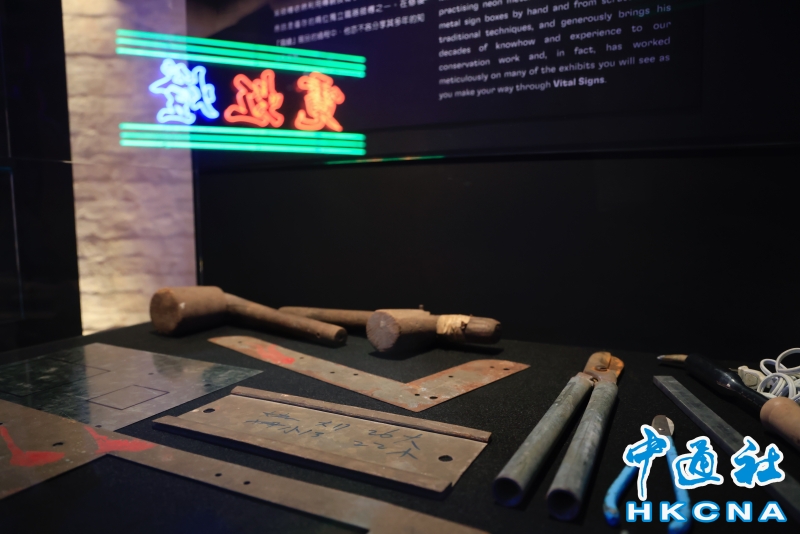 近日,香港中環大館推出《霓續》展覽,展示香港獨特而鮮明的霓虹燈視覺文化形象。觀眾可以欣賞到超過20個霓虹燈招牌,感受其重新綻放出的絢麗光芒;當中不少霓虹招牌更是由霓虹交滙團隊保育下來、重新安裝後首次向公眾展示。圖為製作流程及工具展示。(香港中通社記者 曹文毓攝) 香港中通社圖片