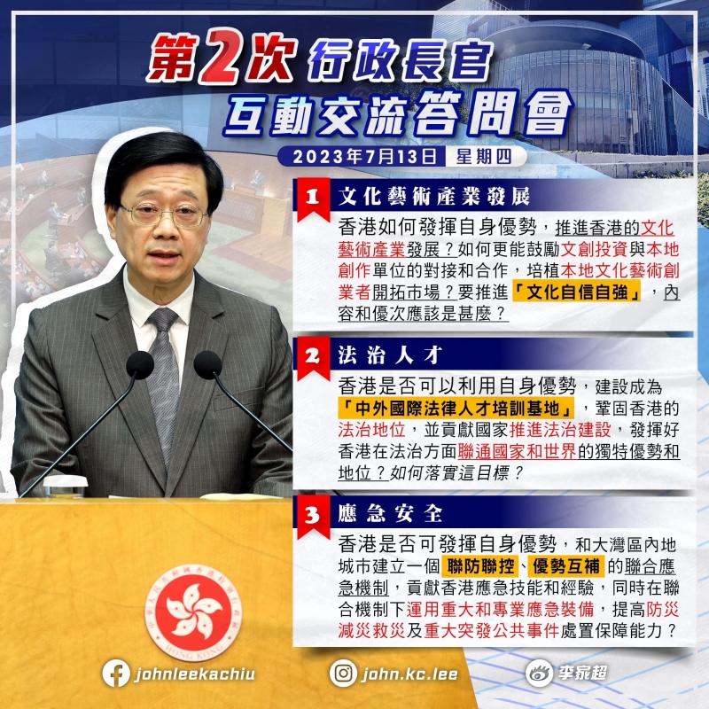 李家超fb圖片。 他提及,第二次答問會第一節主題為“文化藝術產業發展”,指香港有中西匯聚優勢,恆常舉辦世界級文化盛事,要研究如何發揮好現有的優勢、培植本地文藝界開發市場等。而第二節主題則為“法治人才”和“應急安全”。香港在法治上有許多建樹,有良好法治制度,而人才亦備受國際認可,會討論是否可以利用好這些優勢,成為中外法律人才培訓基地,鞏固國際地位及協助國家法治建設。 至於“應急安全”方面,李家超指,香港已累積很多良好經驗,包括土耳其救援工作,但在硬件方面資源始終有限,而隨著內地城市不斷強化救災能力,討論香港如何發揮自身優勢,與大灣區內地城市建立應急機制,優勢互補。李家超又說,歡迎議員提出建議或提問,讓大家可以深入探討及交流。 李家超隨後在社交平台發文,指在首次互動交流答問會結束後,他與部分議員見面,深入討論和交流他們所提出的意見和建議,並感謝他們的見地和積極投入,期望在第二次互動交流答問會裡,延續和增強良好的諮詢和交流互動模式。(完) 【編輯:孟宜君】