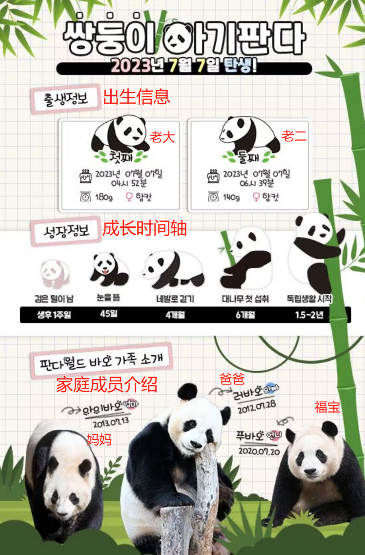 大熊貓愛寶和雙胞胎BB 韓國《朝鮮日報》11日發布的這張海報,標題為《大熊貓雙胞胎幼崽 2023年7月7日誕生!》,內容分三部分。其中,第一部分是“出生資訊”,介紹了這對幼崽的出生時間、體重和性別。