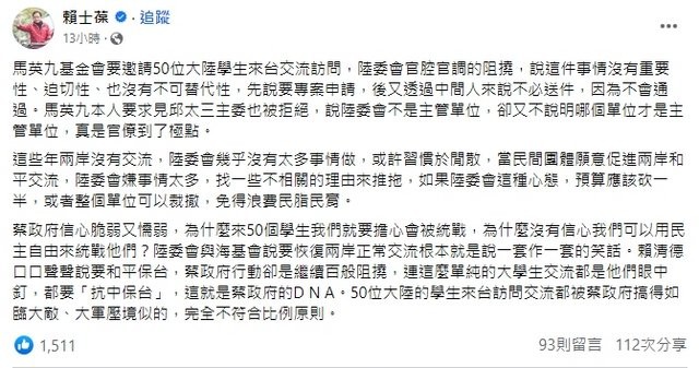 馬英九遊重慶,獲大陸街頭民眾跟拍、熱情問好。圖源:馬英九辦公室 本次陸生訪台團緣起於馬英九今年3月回大陸的返鄉祭祖之旅。馬英九在是次參訪中除返鄉祭祖、重溫歷史外,還帶領台灣青年學生造訪了三所大陸高校,兩岸學子面對面熱烈交流,暢談學習生活和夢想追求,成為此行一大亮點。馬英九在交流活動中當面邀請大陸學生回訪,獲得大陸方面積極回應。 基於“你來我往”原則,5月起馬英九基金會積極規劃,邀請來自大陸五所一流高校的50名學生赴台,並按照台陸委會的要求做了準備。比如,放棄以馬英九基金會名義進行,轉而主打學校旗號。大陸學生的行程安排,也僅限於參觀台灣名勝古跡,與島內大學和機構交流等,盡可能避免官方色彩。由於陸委會先前透過學界傳達擔心人數過多、增添維安風險,“馬英九基金會”在和大陸5所大學溝通後,決定把人數由每校10人降為6至7人,讓全團更為精簡、也藉此降低安全顧慮。 然而真到了送件走流程時,陸委會卻一直“冷處理”,還私下請人向馬英九轉達“送了也不會過”。於是馬英九表態願親自拜訪陸委會負責人,說明此案的重要性、急迫性和不可替代性。不過邱太三卻避而不見,其辦公室回復“無法安排”。這個表態引發輿論質疑,“疫情以後兩岸仍未完全放開”,沒啥工作量的陸委會不存在安排不了見面的情況。 隨即,台陸委又會放出“重磅炸彈”,稱其并非主管單位。言外之意即是,你馬英九找錯人了。至於該找什麼部門審批,台陸委會一句話沒說,讓馬英九基金會一方摸不著方向。有趣的是,馬英九和蔡英文都曾做過陸委會的主委,理論上對於兩岸往來的交流審批流程與權限,應該都十分清楚。 中國國民黨“立委”賴士葆6月8日在臉書發文痛批陸委會官僚主義。賴批評稱,這些年兩岸沒有交流,陸委會幾乎沒有太多事可做,現在民間團體願意促進兩岸交流,還官腔官調阻撓,“如果陸委會這種心態,預算應該砍一半,或者整個單位可以裁撤,免得浪費民脂民膏。”賴士葆認為,賴清德口口聲聲說要和平保台,蔡政府行動卻是繼續百般阻撓,連這麼單純的大學生交流都是他們眼中釘,都要“抗中保台”,這就是蔡政府的DNA,“50位大陸的學生來台訪問交流都被蔡政府搞得如臨大敵、大軍壓境似的,完全不符合比例原則。”