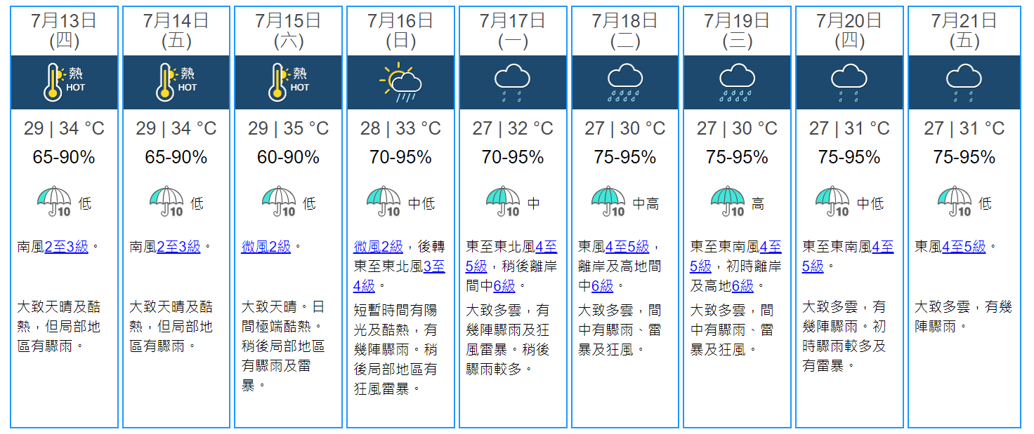 天文台九天天氣預報。 根據天文台地球天氣圖像顯示,該低壓區將於下周二(18日)至周三(19日)最接近香港。而根據天文台九天天氣預報,香港自周日(16日)起天氣逐漸轉差,有幾陣驟雨,局部地區有狂風雷暴,氣溫介乎攝氏28至33度。下周二(18日)及周三(19日)大致多雲,間中有驟雨、雷暴及狂風,吹東至東南風4至5級,初時離岸及高地6級,氣溫介乎攝氏27至30度。隨後2天持續有驟雨,氣溫介乎攝氏27至31度。 (完) 【編輯:孟宜君】