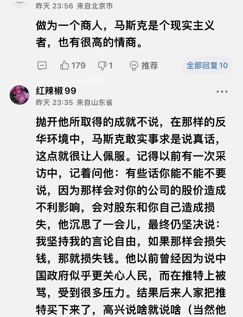中國網友在相關新聞下的評論截圖 在美國政客不停炒作中國威脅論之際,中國的網友們卻早已看得真切,認為馬斯克此番言論是在商言商,從商業規律出發,理性的看待中國的市場,客觀評價中國在科技、產能和供應鏈方面的優勢。 (完) 【編輯:王軼南】