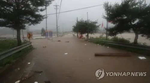 7月15日上午,因暴雨和槐山水庫洩洪,槐山郡達川水位暴漲。位於大壩下游1公里處的一座橋樑被淹。圖自韓聯社