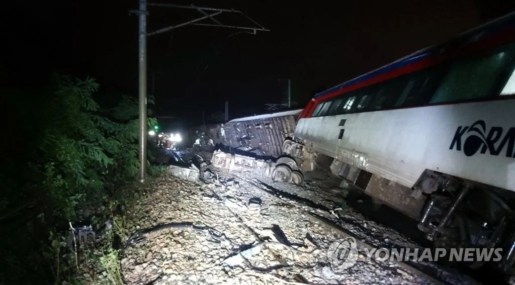 7月14日,忠清北道一輛“無窮花”號列車因撞上突發溜坍侵入線路的泥石流而發生脫軌事故,所幸未造成人員傷亡。圖自韓聯社 據統計,韓國公共設施受損31起,私人設施受損71起。截至當天下午2時,農田受災面積達到9309.5公頃。 韓國氣象廳表示,忠清道、京畿道北部和慶尚北道等地區暴雨預警依然生效。預計忠清道和湖南(全羅道和光州市)等地到17日纍積雨量可達大到暴雨,損失規模恐進一步增加。
