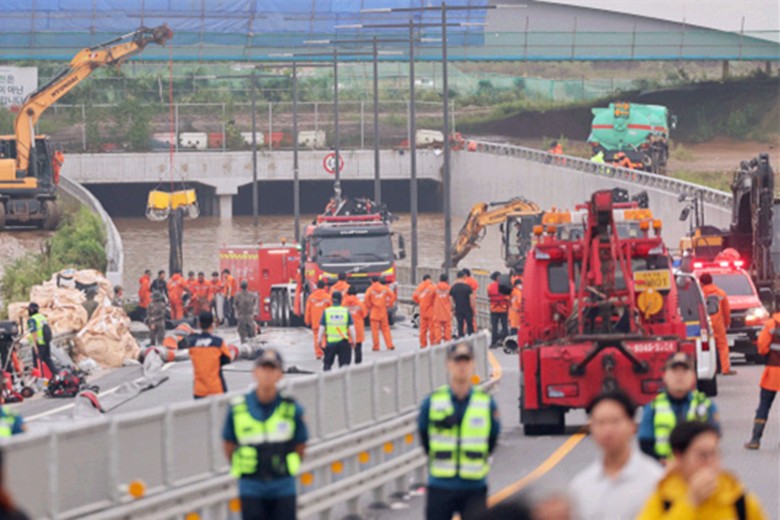 韓國消防員在慶尚北道榮州市長壽麵開展救援。圖自韓聯社 當地時間7月16日,韓國救援人員在忠清北道清州市五鬆地區被淹地下車道內找到7具遇難者遺體。據悉,忠清北道清州市一個地下車道15日被水淹沒。據韓國消防部門通報,截至15日晚,仍有15輛車被困,已造成1人死亡、11人失蹤。