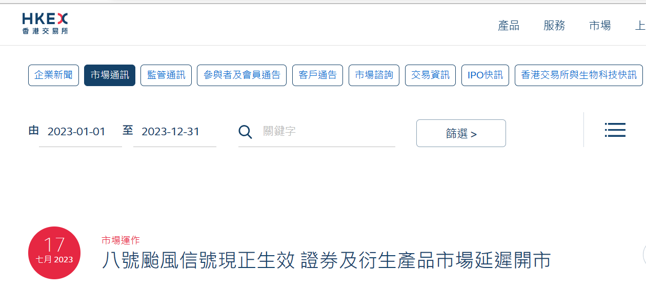圖源:香港交易所 記者致電香港交易所電話尋求確認信息,對方一直處於繁忙狀態,未能接通電話。此後記者又致電匯豐金融服務有限公司,也無人接聽電話。 記者從香港交易所網上關於颱風、極端情況及黑色暴雨期間的安排的網頁,獲得如下的解釋:
