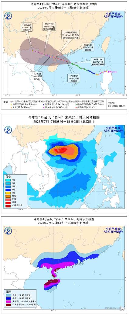 颱風“泰利”來勢洶洶,內地多地啟動應急響應香港新聞網7月17日電 中央氣象台7月17日06時繼續發佈颱風橙色預警: 今年第4號颱風“泰利”(強熱帶風暴級)的中心今天早晨5點鐘(北京時,下同)位於中國廣東省湛江市東偏南方向約375公里的南海西北部海面上,就是北緯20.0度、東經113.7度,中心附近最大風力有11級(30米/秒),中心最低氣壓為980百帕,七級風圈半徑300-320公里,十級風圈半徑90公里。 預計,颱風中心將以每小時20公里左右的速度向西偏北方向移動,強度逐漸增強,並於17日夜間在廣東陽江到海南文昌一帶沿海登陸(颱風級或強颱風級,35-42米/秒,12-14級),18日進入北部灣,以後趨向越南北部沿海和廣西沿海。 大風預報:7月17日08時至18日08時,南海大部、北部灣、瓊州海峽、廣東沿海、廣西沿海、海南島沿海、西沙、中沙、南沙及黃巖島附近海面將有6-8級大風,其中南海北部海域、瓊州海峽、北部灣北部海域、廣東中西部沿海、廣西沿海、海南島北部風力有9-11級,颱風中心經過的附近海域和島嶼風力有12-14級,陣風15-16級。 降水預報:7月17日08時至18日08時,廣東西部和南部、廣西中南部、海南島、福建南部等地部分地區有大到暴雨,其中,廣西南部、廣東西南部、海南島中北部等地部分地區有大暴雨,廣東西南部沿海、海南島北部等地局地特大暴雨(250~280毫米)。