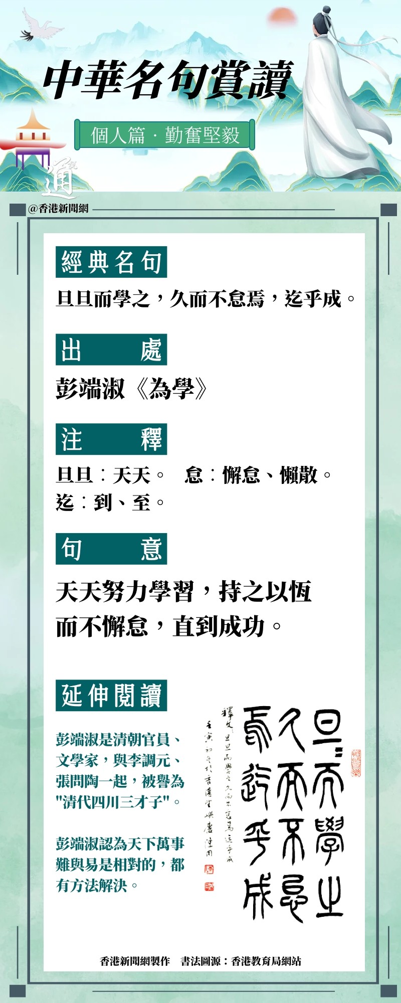 為加強中國文學和文言經典的學習,香港特區政府教育局繼續開展“中華經典名句推廣活動”,從《致知達德》(中華傳統美德語文學習資源)中選取40則名句,作為本學年推廣的內容。香港新聞網“中華名句賞讀”系列今日解讀名句“旦旦而學之,久而不怠焉,迄乎成”。