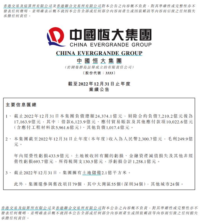 恒大集團財務公告 圖源:網絡 目前,中國恒大一方面與境內其他貸款人積極磋商借款展期事宜,積極與債權人溝通,以解決未決訴訟;同時,在境外債務方面,中國恒大稱將繼續跟進尚未完成的擬定境外債務重組。 而耐人尋味的是,中國恒大的外聘核數師栢誠會計師事務所有限公司(簡稱“上會栢誠”)在年報中表示,對該年報無法發表意見。 上會栢誠表示,如中國恒大披露的淨虧損、淨負債及現金情況,因為中國恒大因各種原因涉及多起訴訟和仲裁案件,這些情況加上財務數據表明可能對中國恒大的持續經營能力產生重大疑慮的重大不確定因素,因此其可能無法在正常業務過程中變現其資產和清償負債。 2021年9月後,中國恒大的銷售一度陷入停滯。從已有公開數據看,公司銷售從2022年4月份開始逐漸恢復,2022 年全年,中國恒大實現合約銷售金額317億元,合約銷售面積390.4萬平方米,全年累計銷售回款357.9億元。至2022年12月31日,包括完全竣工及在建的在售項目累計達1241個。 但是這些數據離恒大所要償還的債務相比實在是杯水車薪。數據的背後,還有恒大每日每時需要面對的龐大集團運營的支出以及一連串需要處理的鬧心事。截至2022年12月31日,恒大目標金額3000萬元以上未決訴訟案件數量共計1,519件,目標金額總額累計約3953.96億元。 恒大集團在債務泥潭里深陷了600多天,恒大許家印也掙扎了600多天,如今從財報情況看來,恒大地產集團仍沒有從深淵中走出,恒大債務難點依然沒有解決的前兆。 已千瘡百孔的恒大集團,或許未來還能活著,就是最大的成功。(完) 【編輯:錢林霞】