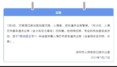 香港新聞網7月19日電 經奮力搶修及全面安全評估後,文錦渡口岸今天(19日)上午7時起,恢復北上客車通關業務(含小車及大客車)。對此,客車運輸公司及兩地牌小車司機表示歡迎。 深圳市人民政府口岸辦公室7月18日發布公告,稱7月9日文錦渡口岸出現地面沉降,入境客、貨車通關業務暫停。經奮力搶修,專業機構全面安全評估,定於7月19日上午7時起恢復入境方向客車通關業務(含小車及大客車)。至於入境方向貨車通關業務的恢復時間,則會另行公告。