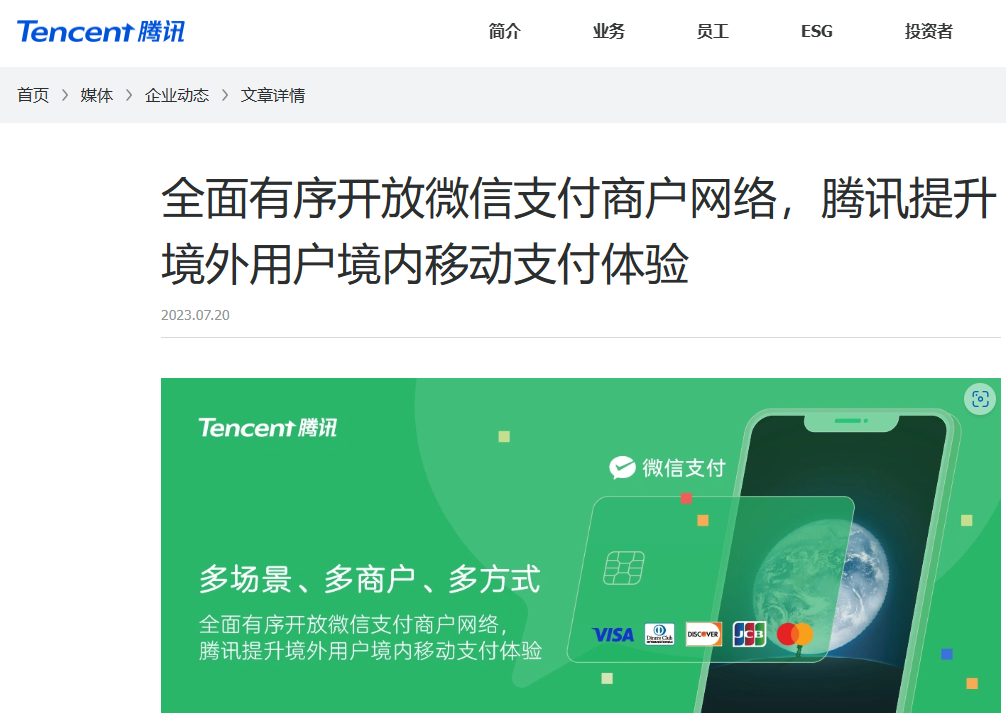 香港新聞網7月20日電 騰訊今天在其官網(20日)宣布,全面有序開放境內各城市的微信支付商戶網絡。意味著境外用戶的微信支付可綁定國際銀行卡,在中國大陸境內使用。 記者從騰訊官網瞭解到,為進一步提升境外用戶在境內的移動支付體驗,騰訊攜手Visa、Discover Global Network(含Diners Club)、JCB、Mastercard等國際卡組織深化合作,近日全面有序開放境內各城市的微信支付商戶網絡,支持餐飲、交通、商超、酒旅等各領域商戶,支持掃碼、被掃、微信小程序、In-APP多種支付方式,不斷拓展消費場景。