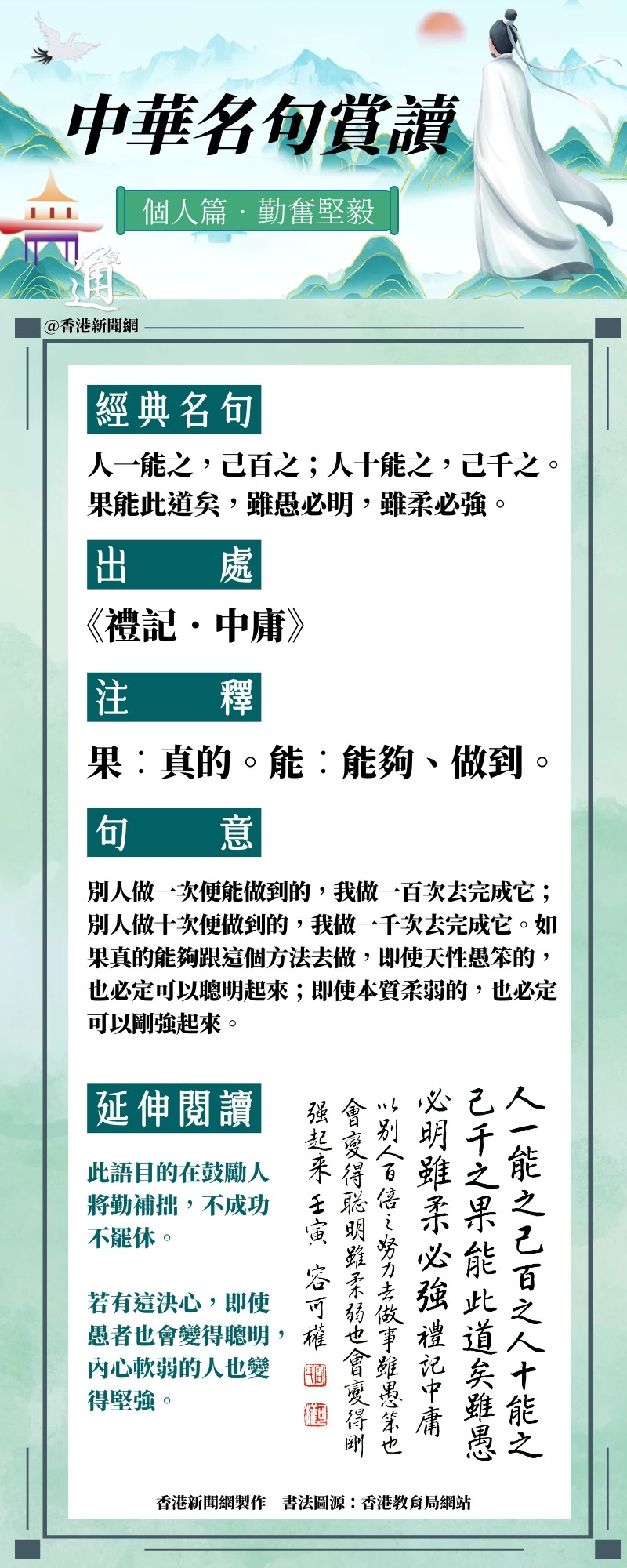 香港新聞網8月7日電 “人一能之己百之,人十能之己千之”這句話出自《禮記·中庸》,告訴人們:別人一次就可以學會的東西,自己可以花上百次去學;別人十次能掌握的東西,自己可以花上千次。這裡說的是做事的態度,要有個堅持不懈的態度,我們現在俗話說“笨鳥先飛”也是這個理。 為加強中國文學和文言經典的學習,香港特區政府教育局繼續開展“中華經典名句推廣活動”,從《致知達德》(中華傳統美德語文學習資源)中選取40則名句,作為本學年推廣的內容。香港新聞網“中華名句賞讀”系列今日解讀:“人一能之,己百之;人十能之,己千之。果能此道矣,雖愚必明,雖柔必強。”