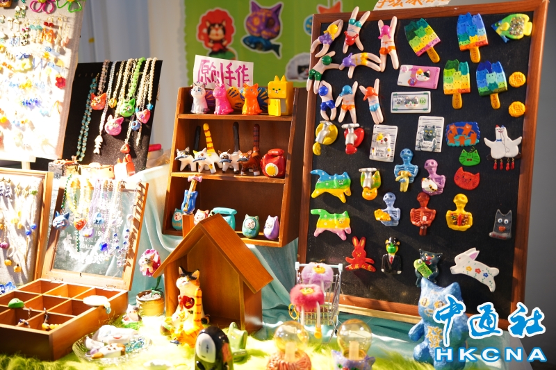 •   北京晴鬆藝術市集的攤位上,攤主正在售賣的原創手作工藝品。 香港中通社圖片