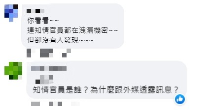有網友質疑台“知情人士”外洩消息給外媒:“知情官員是誰?為什麼跟外媒透露訊息?”“你看看~~連知情官員都在洩漏機密~~但卻沒有人發現~~~”
