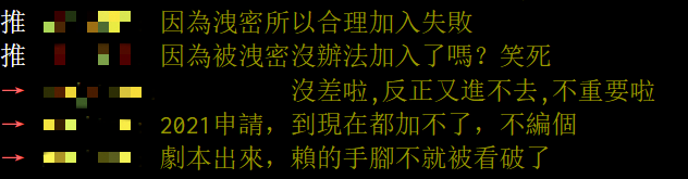 有網友“點破”民進黨“真實意圖”:“喔是喔 所以因為洩密不能加入對不對?”“因為洩密所以合理加入失敗。”“知道申請不過,提前找好藉口?”