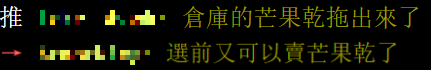 還有網友嘲諷民進黨又賣“芒果乾”:“倉庫的芒果乾拖出來了”“選前又可以賣芒果乾了”。