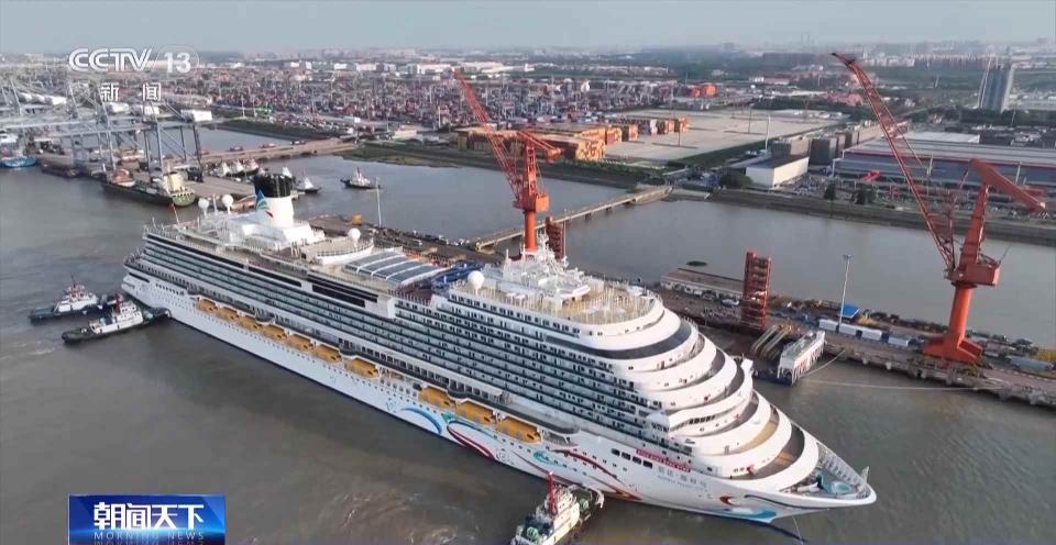 據央視新聞客戶端報道,在4艘拖輪的幫助下,首艘國產大型郵輪24日靠泊上海外高橋碼頭,這次試航從7月17日開始,歷經8天,試航任務涉及推進系統、操作系統以及舒適性等60餘項試驗任務。