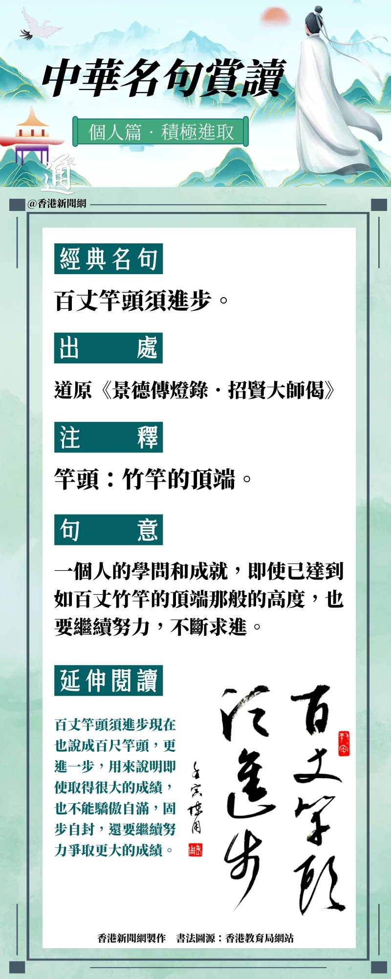 香港新聞網8月23日電 祝賀別人成功,我們會說:“祝你百尺竿頭更進一步。”在古書,則有“百丈竿頭須進步”。百丈竿頭須進步,出自道原《景德傳燈錄.招賢大師偈》。竿頭是竹竿的最頂部,要再高一等,就要高於竹竿的頂處,意思是一個人學問和成就,即使已達到如百丈竹竿的頂端那般的高度,也要繼續努力,不斷求進。 為加強中國文學和文言經典的學習,香港特區政府教育局繼續開展“中華經典名句推廣活動”,從《致知達德》(中華傳統美德語文學習資源)中選取40則名句,作為本學年推廣的內容。香港新聞網由此推出“中華名句賞讀”系列。