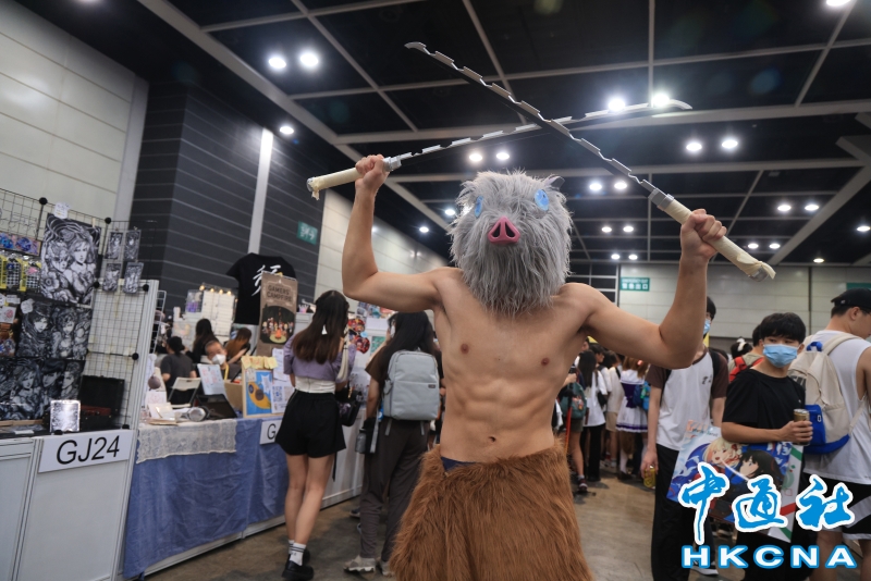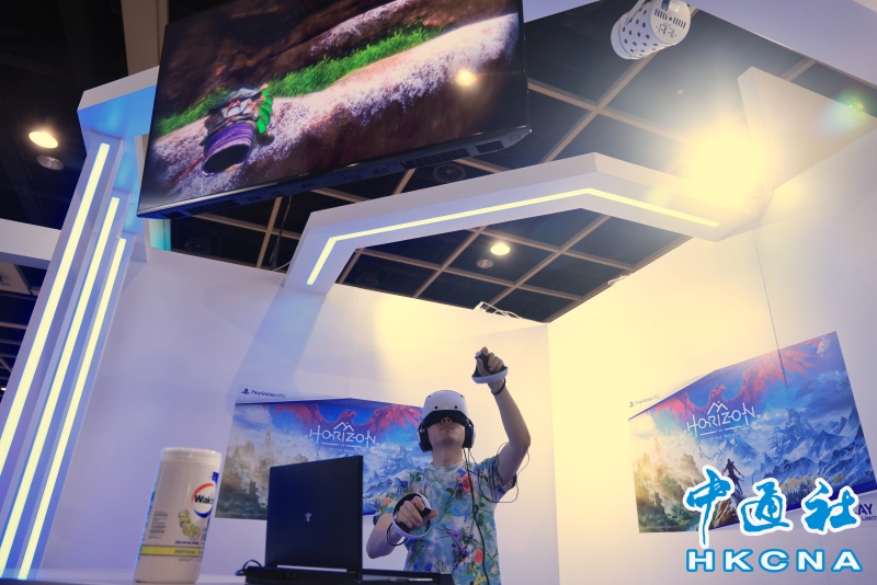 第24屆香港動漫電玩節7月28日起一連5日在香港會展中心舉行。本屆香港動漫電玩節展場總面積達19890平方米,有122間參展商參展、共有589個展位,同人區攤位數達242格,集合最受歡迎的動畫、漫畫、電玩、遊戲、玩具模型、精品及一系列多元的精采表演活動。同期舉行的潮巨匠藝術玩具展更集合了不同潮流及巨匠設計藝術家的作品。圖為市民體驗VR遊戲。(香港中通社記者 許其皓攝) 香港中通社圖片