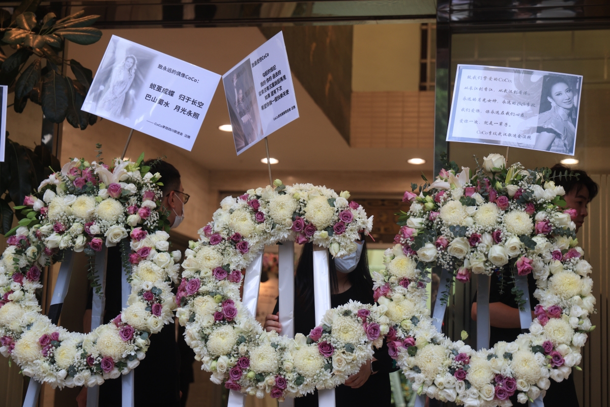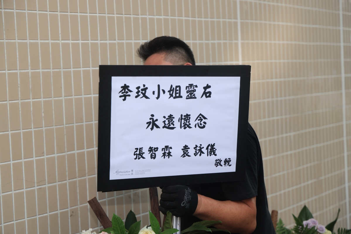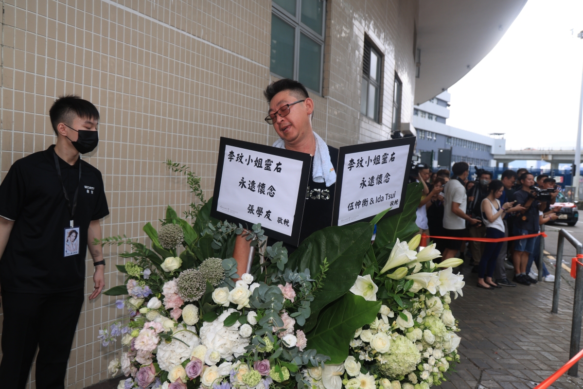 藝人張智霖、袁詠儀等人致送花牌悼念 在香港殯儀館門外人山人海,各地的歌迷早早前來排隊入場,有歌迷精心準備了紀念卡片、花束、花牌送別李玟。