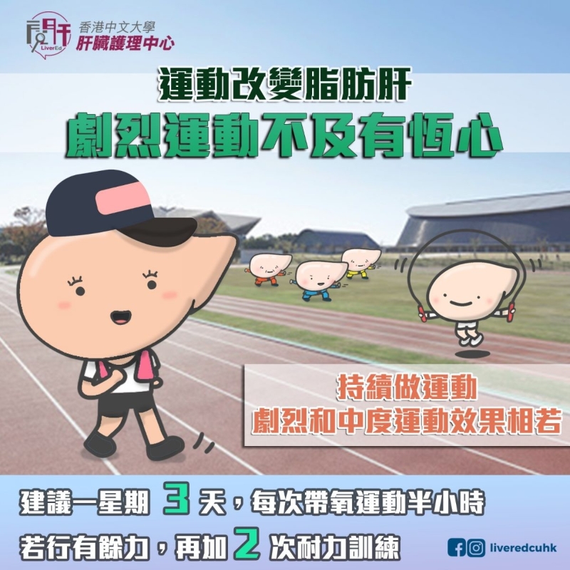 動起來!做運動改善脂肪肝。(圖片:中大肝臟護理中心) 改善脂肪肝的主要途徑是減脂減重,在芸芸飲食方法中,專家們建議參考地中海式飲食,也就是希臘、西班牙、南意大利等南歐地區的傳統飲食。宏觀來看,地中海式飲食的原則是: • 大量的穀物,豆類,堅果類,種子類,生果和橄欖油。 • 大量蔬菜,每天至少吃5份蔬果,每份約80克。 • 肉食以魚肉為主。 • 小量的乳製品、白肉和雞蛋。 • 避免紅肉和加工肉類。 • 飲酒適度,多數是葡萄酒。