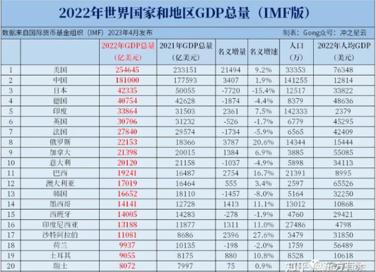2022年世界国家和地区GDP总量排行榜 在以國民生產總值(GNP)為主要指標的1968年,日本超過當時的西德,成為全球第二的經濟大國。2010年被中國趕超,排名跌至第三。當前中國與印度增長勢頭迅猛。該資料最遠預測到2028年為止,美國第一、中國第二的排名在此時間範圍內不變,不會發生“美中逆轉”。 如果按兵推預測,以目前日本為4.233萬億美元的GDP來算,影響三成,意味著日本將損失約1.27萬億美元,GDP跌至2.96萬億美元,以此排名的話,日本將直線下跌至排名的第7位。 另受各國央行快速加息的影響,發達國家短期內經濟增速將放緩,如果日元進一步貶值,情況或可能更不好。 (完) 【編輯:錢林霞】