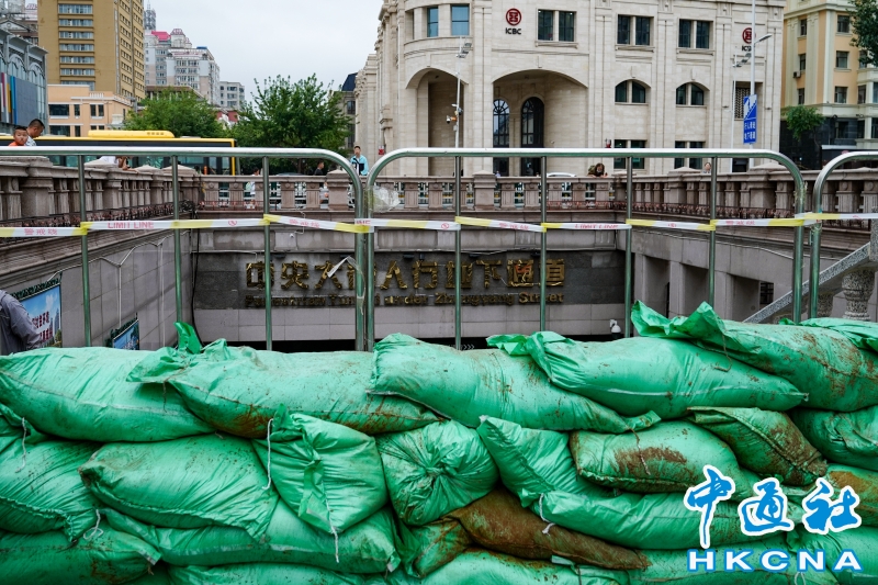 •   8月2日,黑龍江哈爾濱,一處地下通道入口處壘砌起沙袋。當日,哈爾濱市氣象台發布暴雨紅色預警信號。 香港中通社圖片