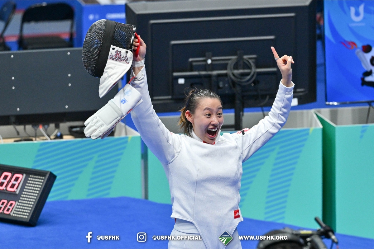 佘繕妡女子重劍個人賽封后 。USFHK FB圖片 連同港隊許得恩在男子太極劍摘得首金,香港代表團累計共奪2金、1銀、3銅,合共6面獎牌。 佘繕妡賽後表示,自己是憑意志力支撐整個比賽,當天清晨4時已經起床,吃過早餐便開始準備比賽,直至晚上去到決賽,努力堅持到最後。她又感謝所有支持她的人,希望今次摘金可以推動劍擊項目發展,亦為喜歡運動的人帶來推動力。 現年22歲的佘繕妡在加拿大出生,4歲時跟隨家人回港定居。她的父親是前游泳運動員,佘繕妡從小擁有運動天份,曾在劍擊學校訓練,在學習花劍數年後聽從教練建議轉攻重劍。 今次奪金後,佘繕妡將獲得“賽馬會優秀運動員獎勵計劃”頒發世大運冠軍獎金50萬。另外,她將於本周六(5日)出戰女重團體賽。 (完) 【編輯:孟宜君】